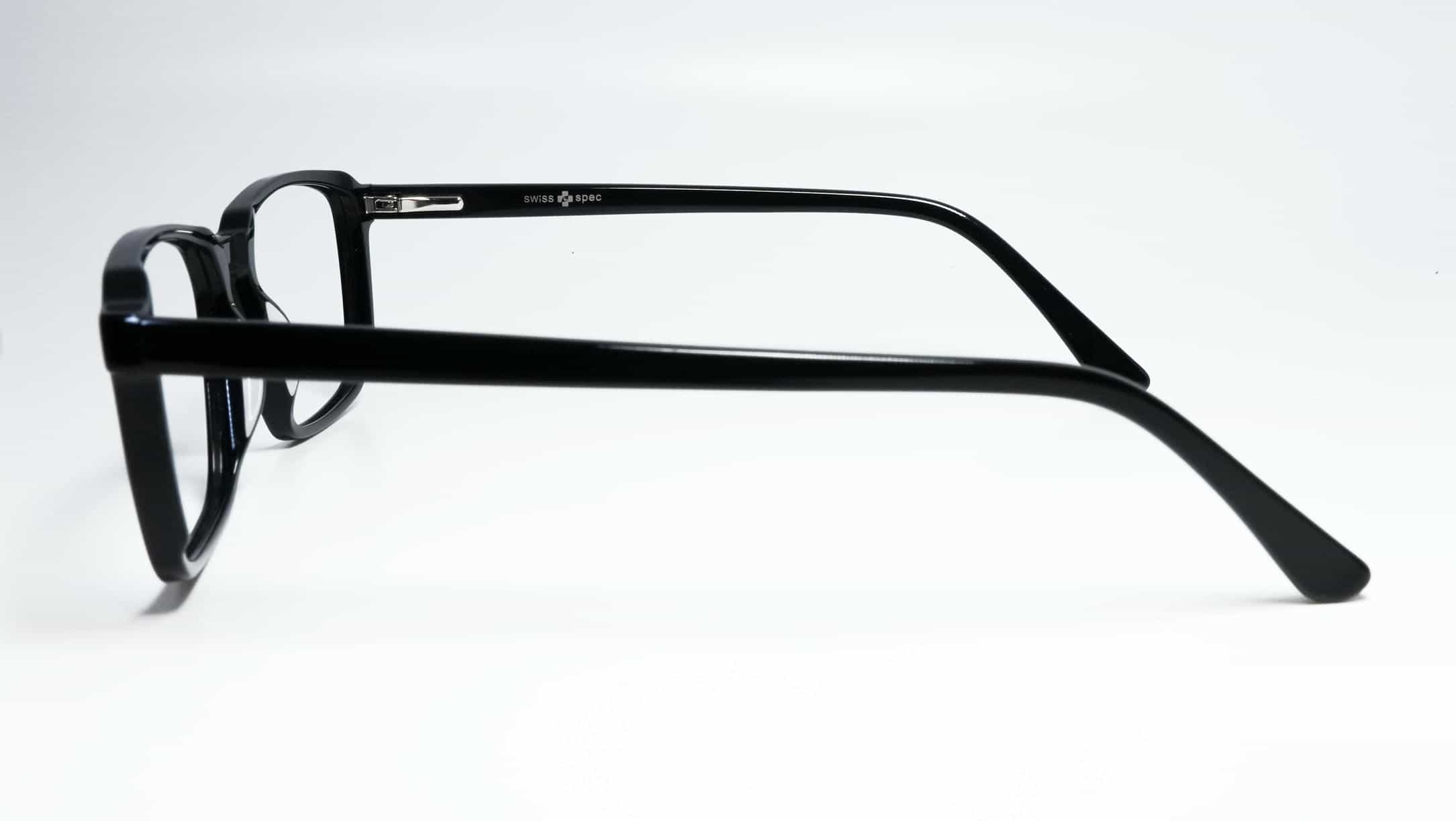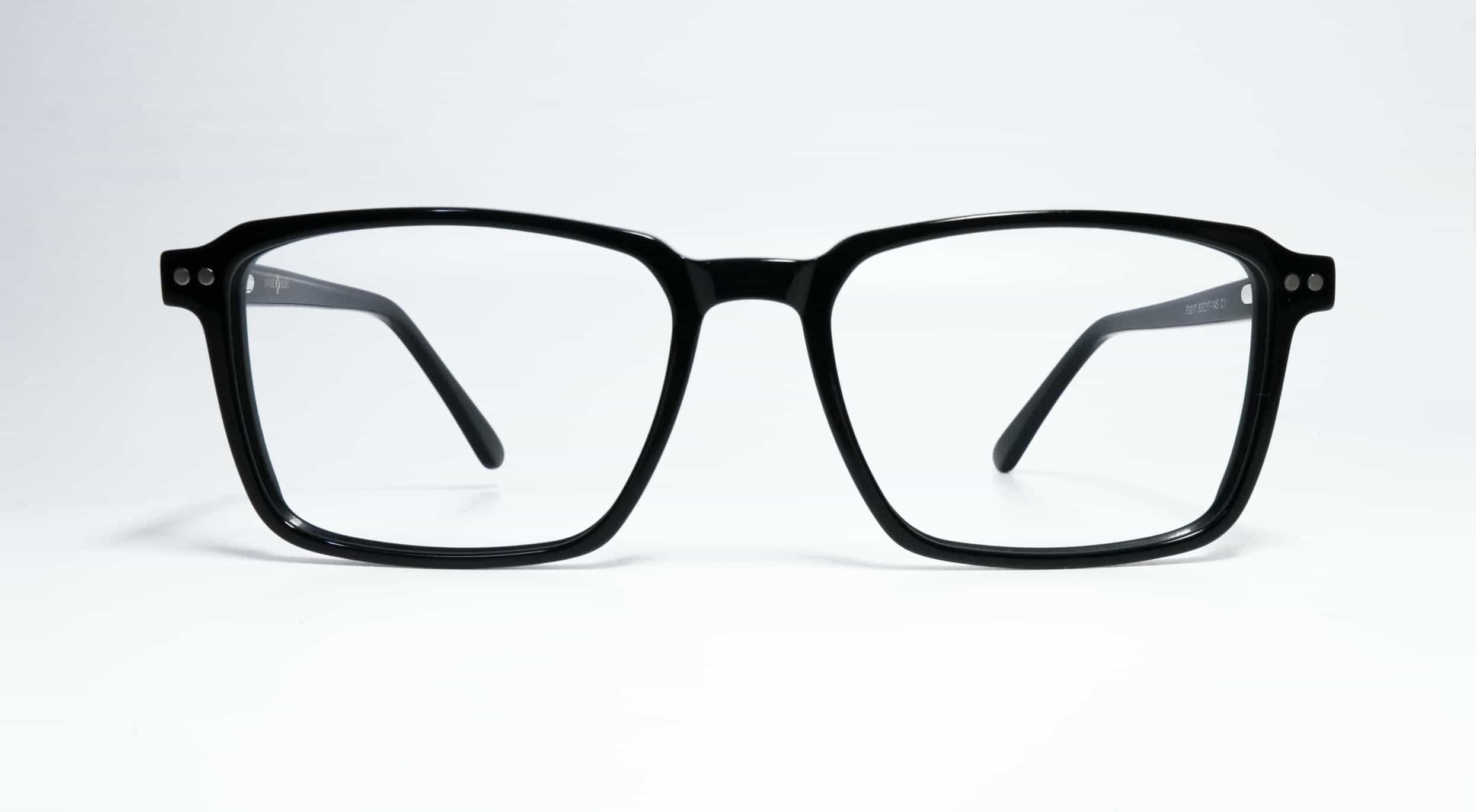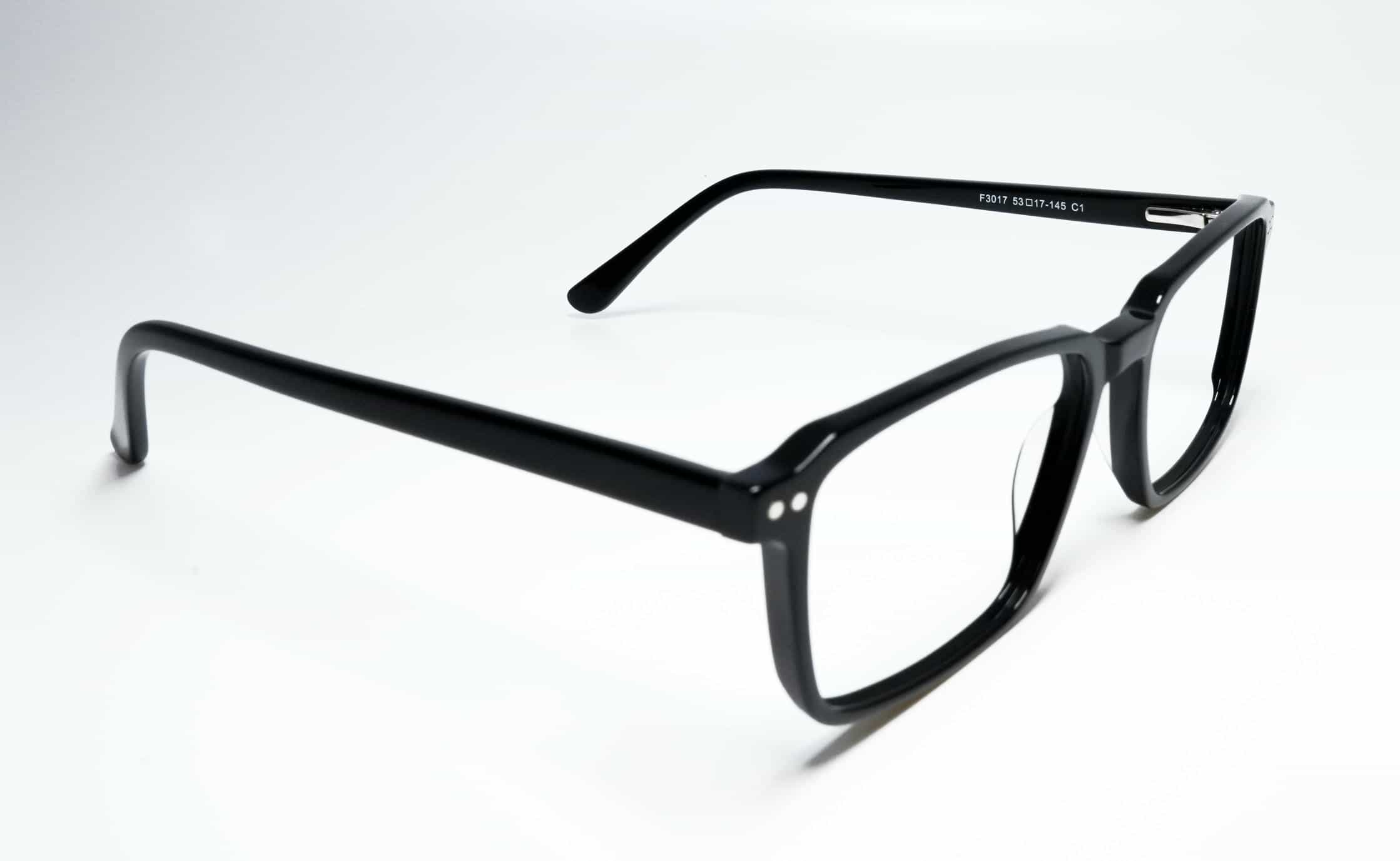 A premium acetate sheet eyewear frame featuring a solid black front and temples, offering a classic look with lightweight comfort and lasting durability.
