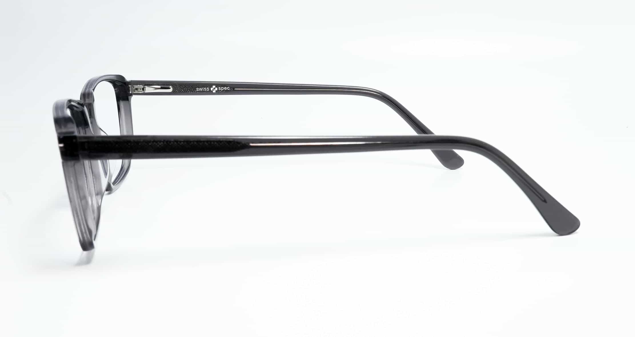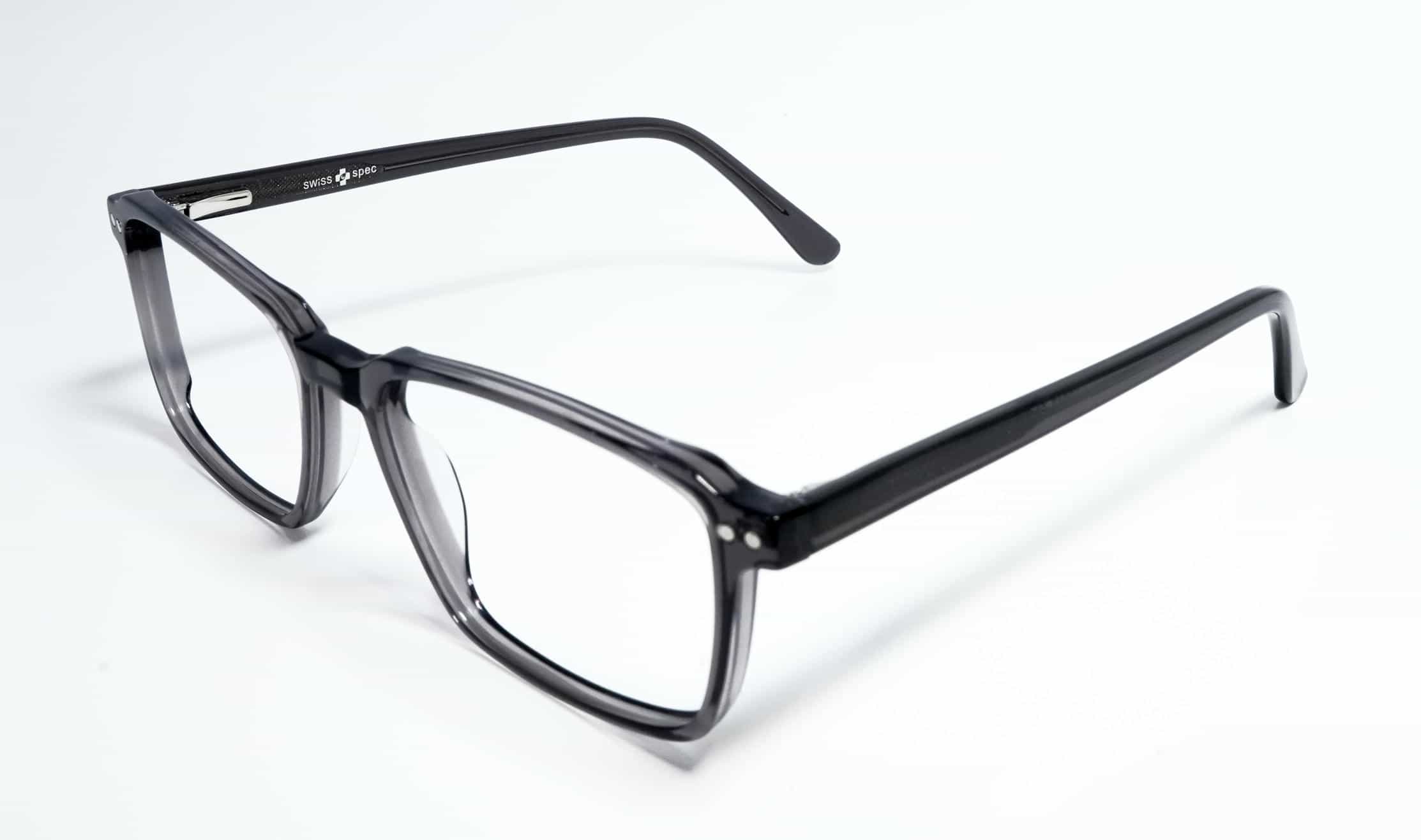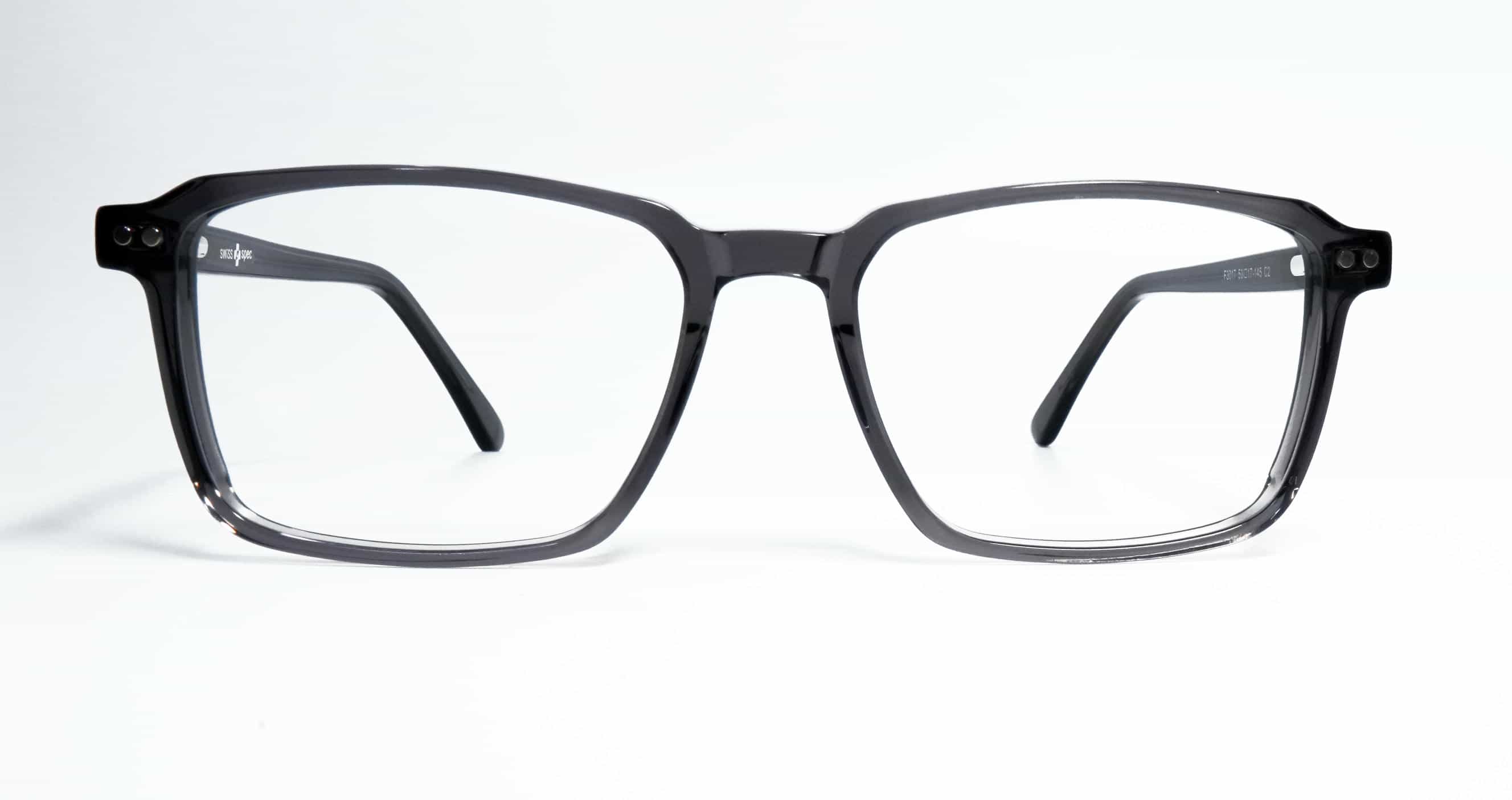 A premium acetate sheet eyewear frame featuring a crystal gray front and temples, offering a classic look with lightweight comfort and lasting durability.